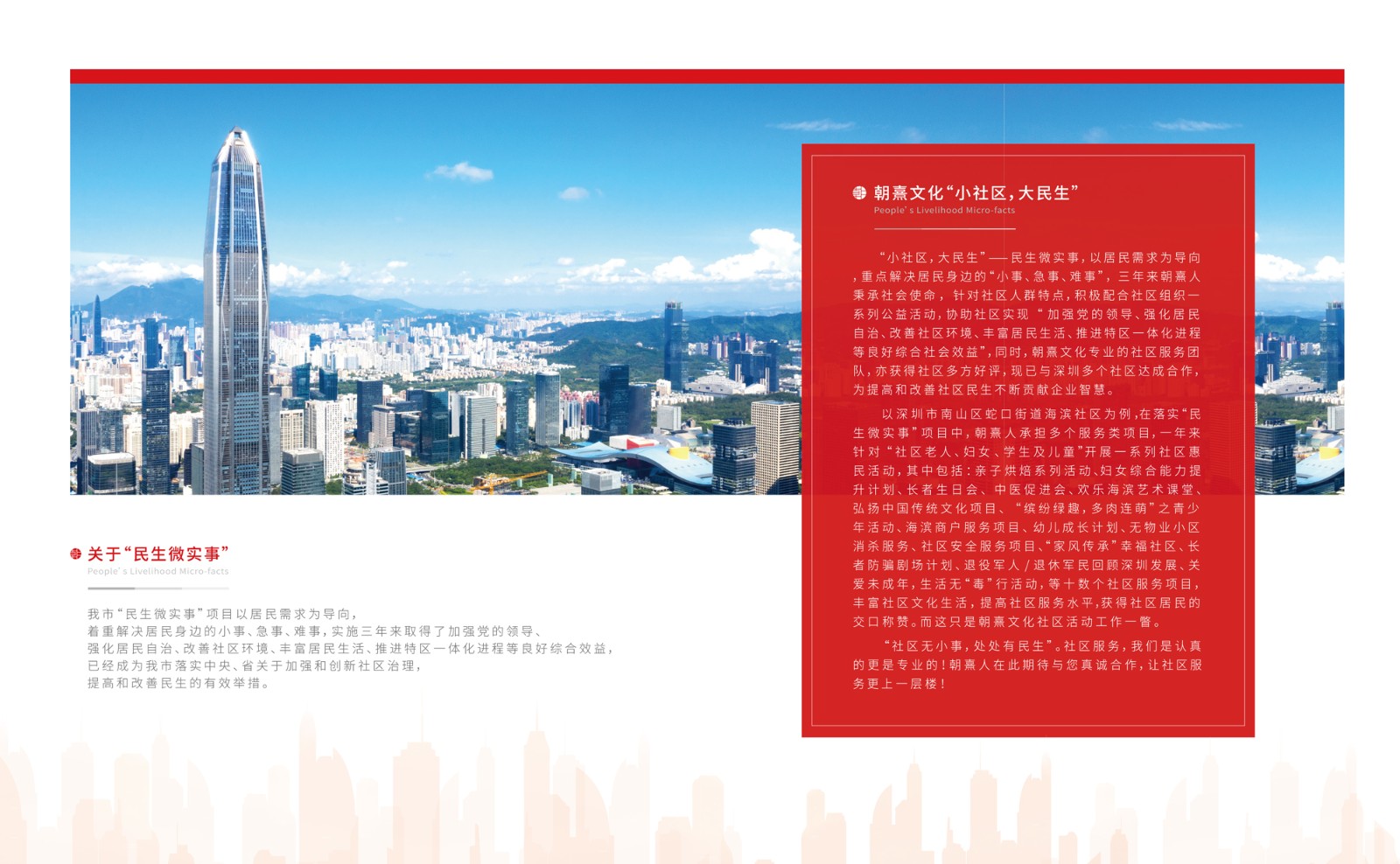 “小社區(qū),大民生”——民生微實(shí)事,以居民需求為導(dǎo)向,重點(diǎn)解決居民身邊的“小事、急事、難事”,三年來朝熹人秉承社會(huì)使命,針對(duì)社區(qū)人群特點(diǎn),積極配合社區(qū)組織一系列公益活動(dòng),協(xié)助社區(qū)實(shí)現(xiàn)“加強(qiáng)黨的領(lǐng)導(dǎo)、強(qiáng)化居民自治、改善社區(qū)環(huán)境、豐富居民生活、推進(jìn)特區(qū)一體化進(jìn)程等良好綜合社會(huì)效益”,同時(shí),朝熹文化專業(yè)的社區(qū)服務(wù)團(tuán)隊(duì),亦獲得社區(qū)多方好評(píng),現(xiàn)已與深圳多個(gè)社區(qū)達(dá)成合作,為提高和改善社區(qū)民生不斷貢獻(xiàn)企業(yè)智慧。