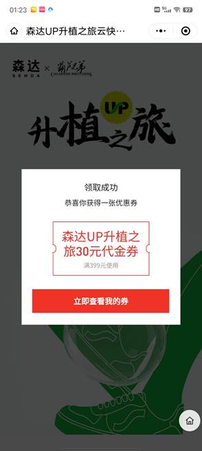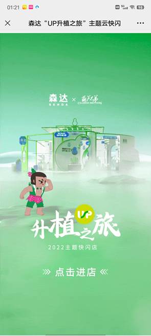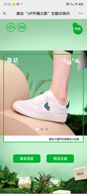 2022年4月,國(guó)潮品牌森達(dá)與葫蘆兄弟聯(lián)名推出 “UP升植之旅”系列新款,本次云快閃店以三維展廳的模式,多方位地展示產(chǎn)品細(xì)節(jié),顧客通過點(diǎn)選商品了解詳情,跳轉(zhuǎn)小程序領(lǐng)取優(yōu)惠券并完成購(gòu)買,在疫情期間以線上快閃店的方式達(dá)成宣傳營(yíng)銷的目的。